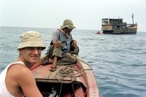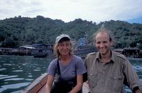 Le Htaik Wai Lin et son équipage nous ont fait vivre des aventures comme celle-ci quotidiennement. Nous avons failli tout perdre, corps et biens à plusieurs reprises, surtout au moment de l'arrivée de la mousson, en mai. Ca a commencé comme une blague dans un dessin animé. Au moment de jeter l'ancre dans une baie pour se protéger de la tempête qui menaçait, un marin s'est pris le pied dans la corde de l'ancre. Un coup de machette précis a vite libéré sa cheville, mais aussitôt le bâteau s'est mis à dériver dangereusement dans le courant. Klaus se préparait déjà à plonger quand, par un incroyable coup de chance, le capitaine soulagé a apercu le bout de la corde de l'ancre flottant entre deux eaux et nous avons pu finalement la récupérer.